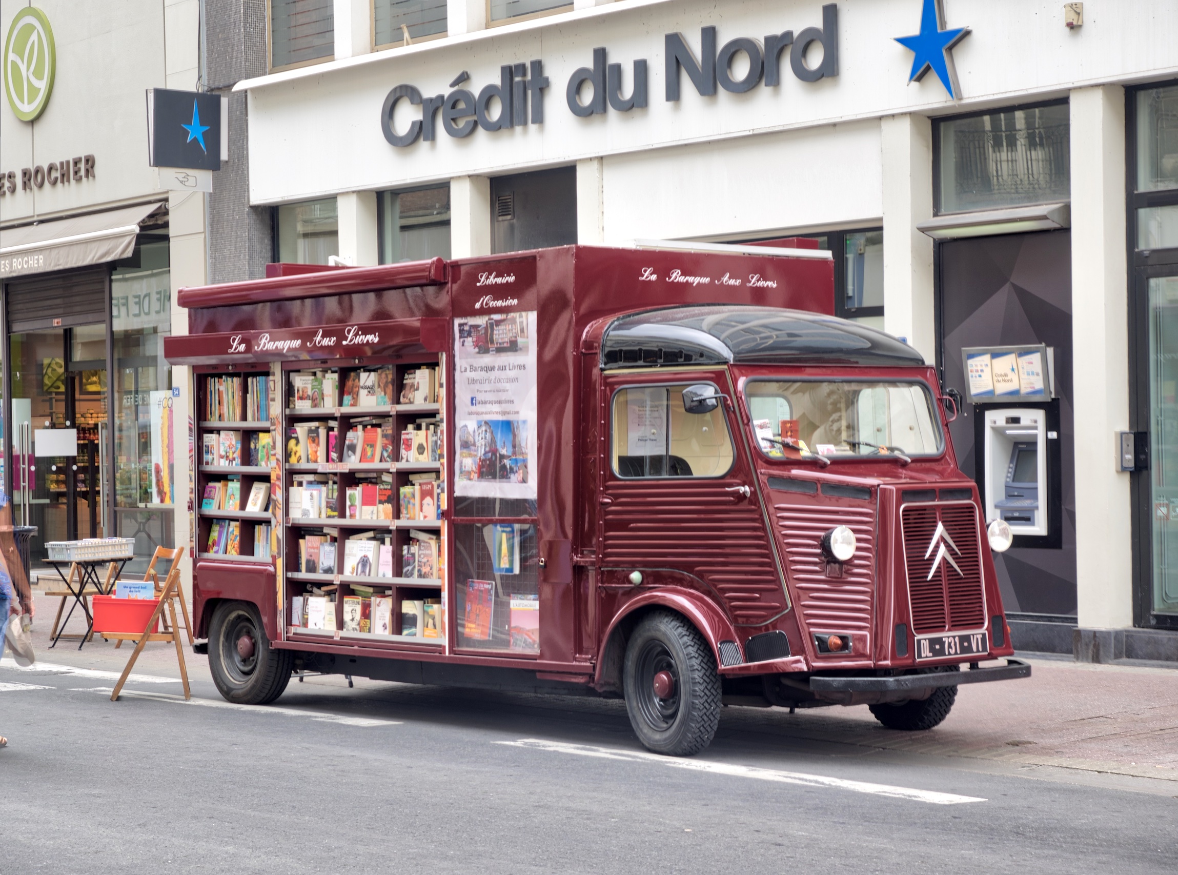 Of course, we were regularly in town to get groceries and food. There were a couple of market days – a couple of small fresh produce markets on different days of the week and a larger clothing/toys market each Saturday. Each of the markets was staged in a different square around the town – a somewhat strange arrangement it seemed to us. One Saturday we happened upon a delightful mobile bookstore – a vintage Citroen van full of all types of books.