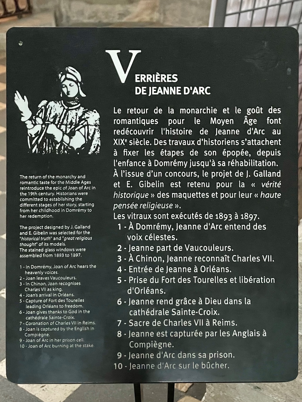 Entering the cathedral, we were immediately enthralled by a series of ten stained glass windows set on either side of the nave, narrating the main events in Joan of Arc’s life.