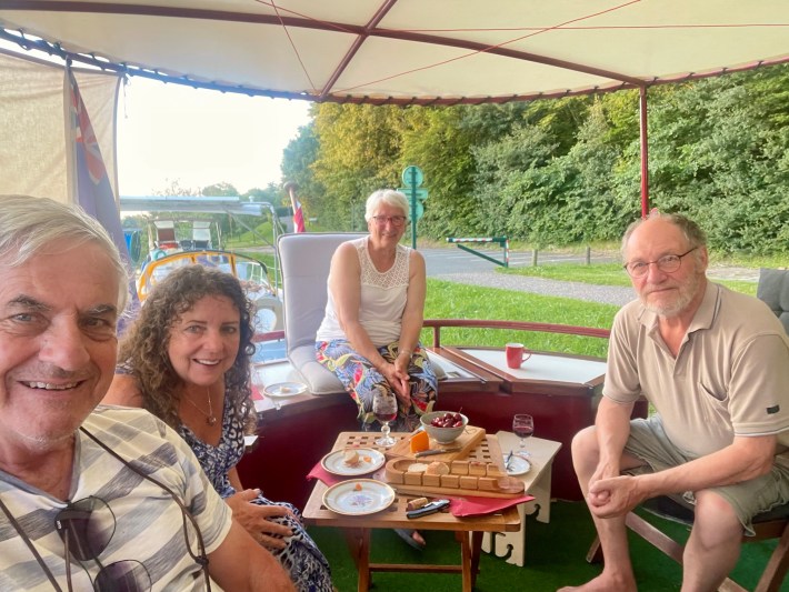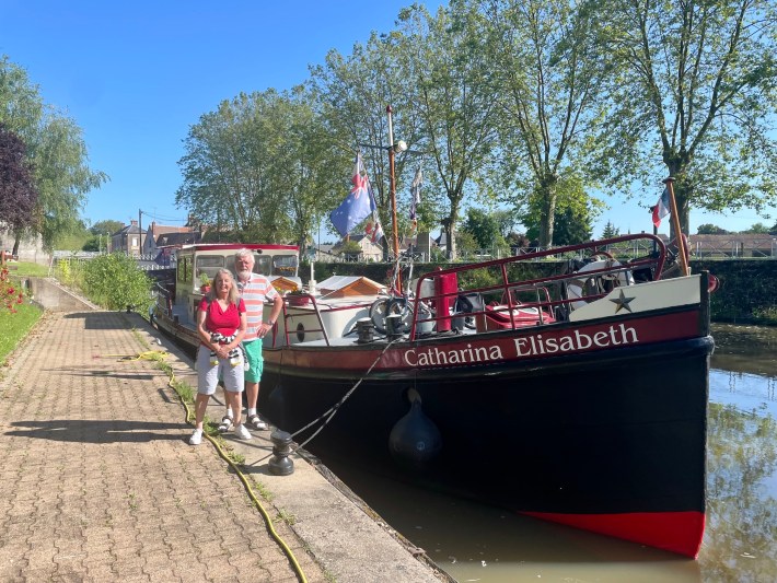 We had the most wonderful surprise when we returned to Catharina. Two boats were now moored behind us and a couple seated at a nearby park bench hailed us as we arrived, “Are you Aussies – we are too”. Quickly we determined that it was Guy and Chantal with whom we had cruised for several days in 2019 on the Canal du Nivernais (including the soul-destroying section from the top down to Châtillon-en-Bazois). They are an adventurous couple who left France in their 20’s, took their family to Australia and had a life of citrus growing followed by owning a prestige winery in Margaret River and becoming Aussie citizens in the process. They returned to France after retiring and have been cruising ever since. We have had several very intense wine-drinking sessions with them over time and another ensued that night where we drank a 12-year-old delicious blended red from Pemberton.