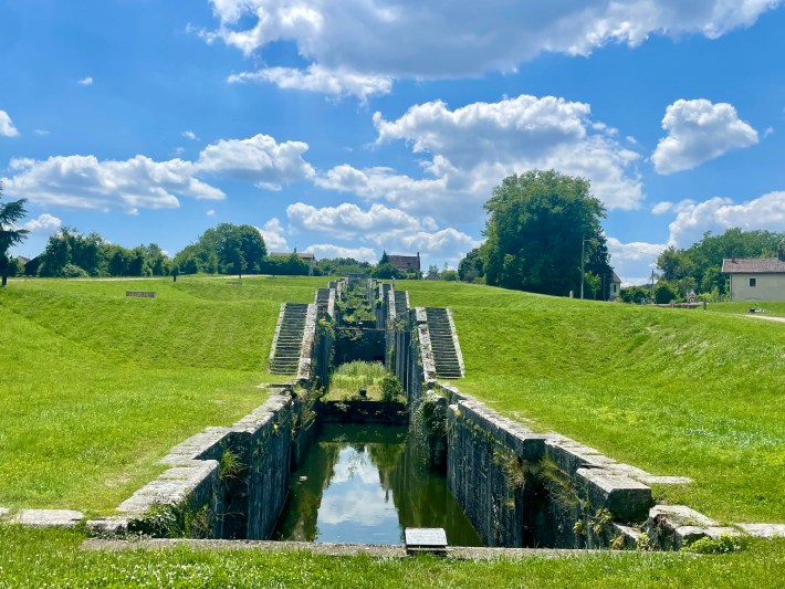 So after passing through the next series of locks, we moored up and took the bikes off to cycle along the towpath to Rogny-les-Sept-Écluses. A lovely ride of about 4 km, following alongside the canal and passing the locks we would go through the next day. There was one unexpected encounter with a snake that was making its way from the undergrowth across the path in front of our bikes. We hauled on the brakes, it tucked its head back out of the way of the tyres, and the three of us continued on our respective ways.