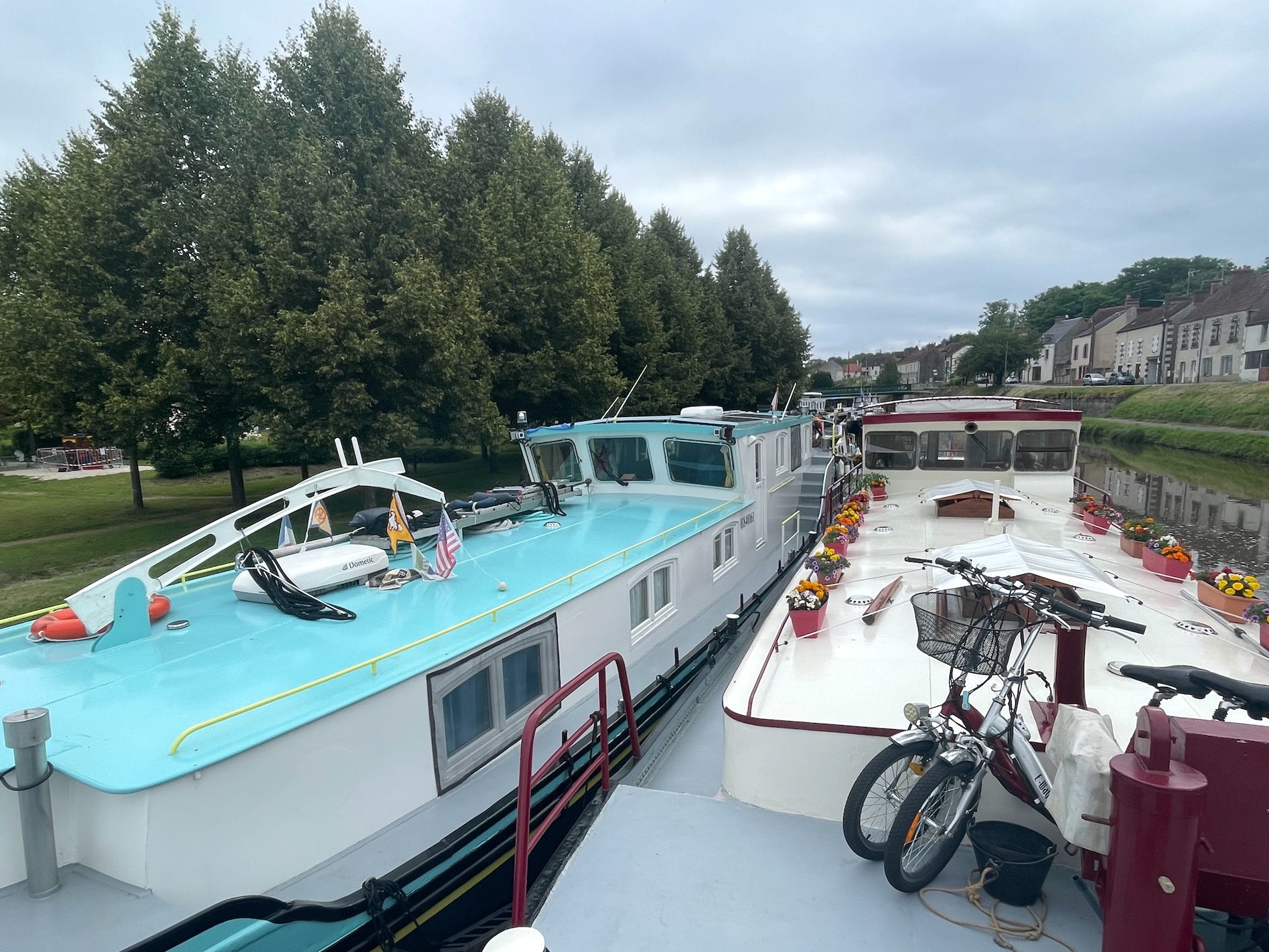 We just took it easy. The following day, our spotters on C.A.R.I.B. III reported that there was space for us at the next place we wanted to stop, so, with confidence we set off for Ouzouer-sur-Trézée. In the event, the arrival of a hotel boat forced us off our mooring (they always have priority) and so we ended up comfortably rafted up alongside Lon and Pat.