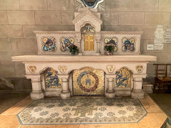 after which she handed us the key to this charming but somewhat frail church and a set of notes in English. We were told to lift the carpet to see the graves of two of the priests, buried beneath the stone floor.