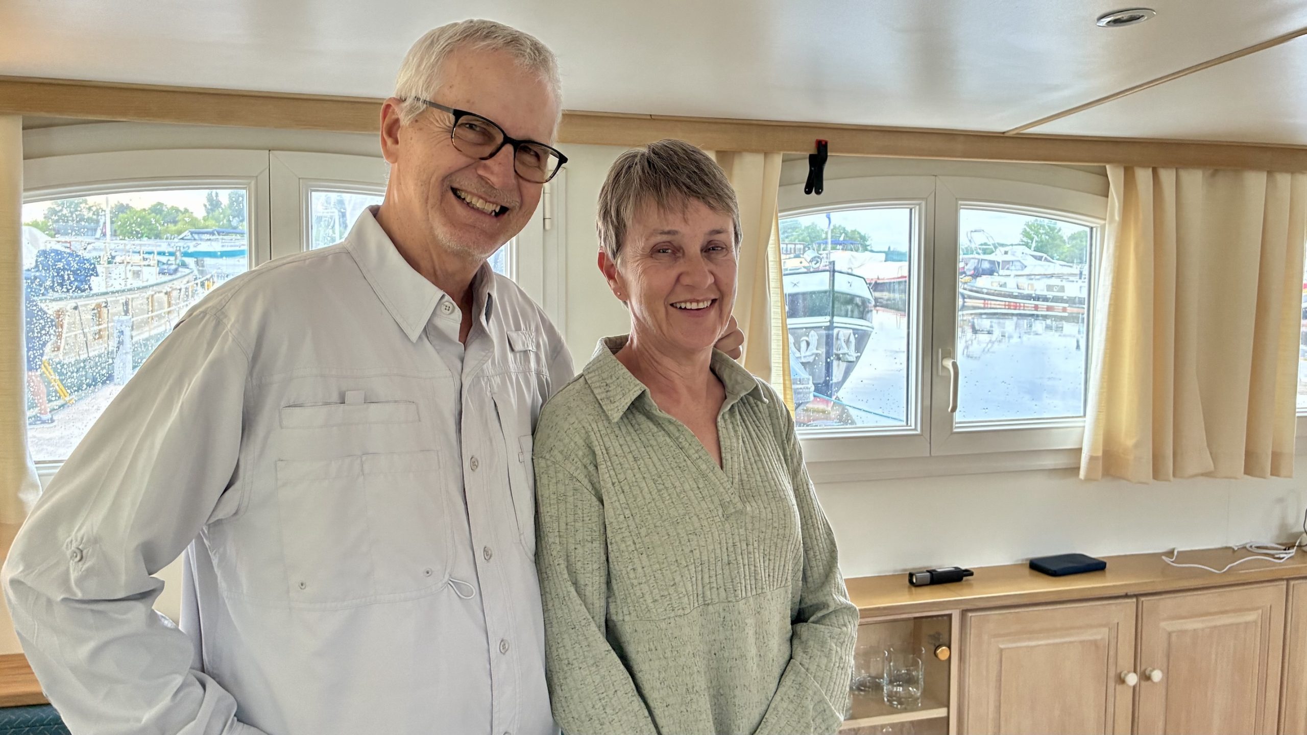 Our great friends from last year, Lon and Pat on C.A.R.I.B. III (Chill And Relax It’s Bargetime) were on the next pontoon. Lon’s bad luck was good fortune for us. Originally they would have been well away by the time we had arrived, but he had slipped, fallen on deck and cracked a rib. The rescue effort took dozens of men from all of the various emergency services and several hours to get him to an ambulance. Eventually they had to lift him overboard into a small boat and ferry him to shore. Fortunately, the injury will self-heal and some pain medication had him up and about. But this delayed their departure and very kindly, they added a couple of days of waiting so we could catch up again.